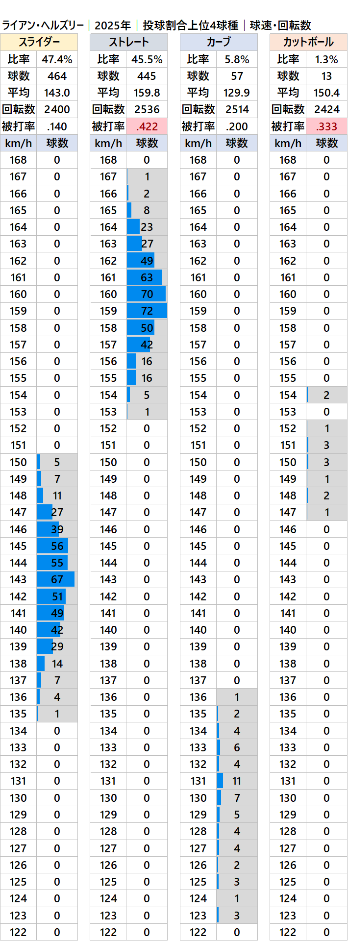 メッツのライアン・ヘルズリー投手の2025年シーズンの球種別の投球割合・球速・回転数・被打率の情報です。