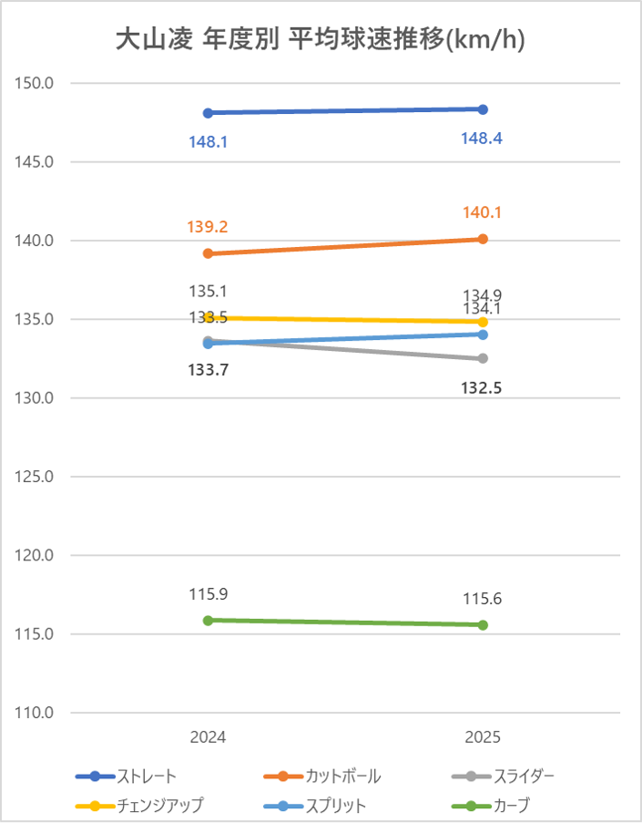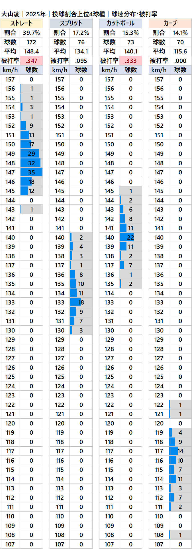 ソフトバンクの大山凌投手の2025年シーズンの球種別の投球割合・球速・被打率の情報です。