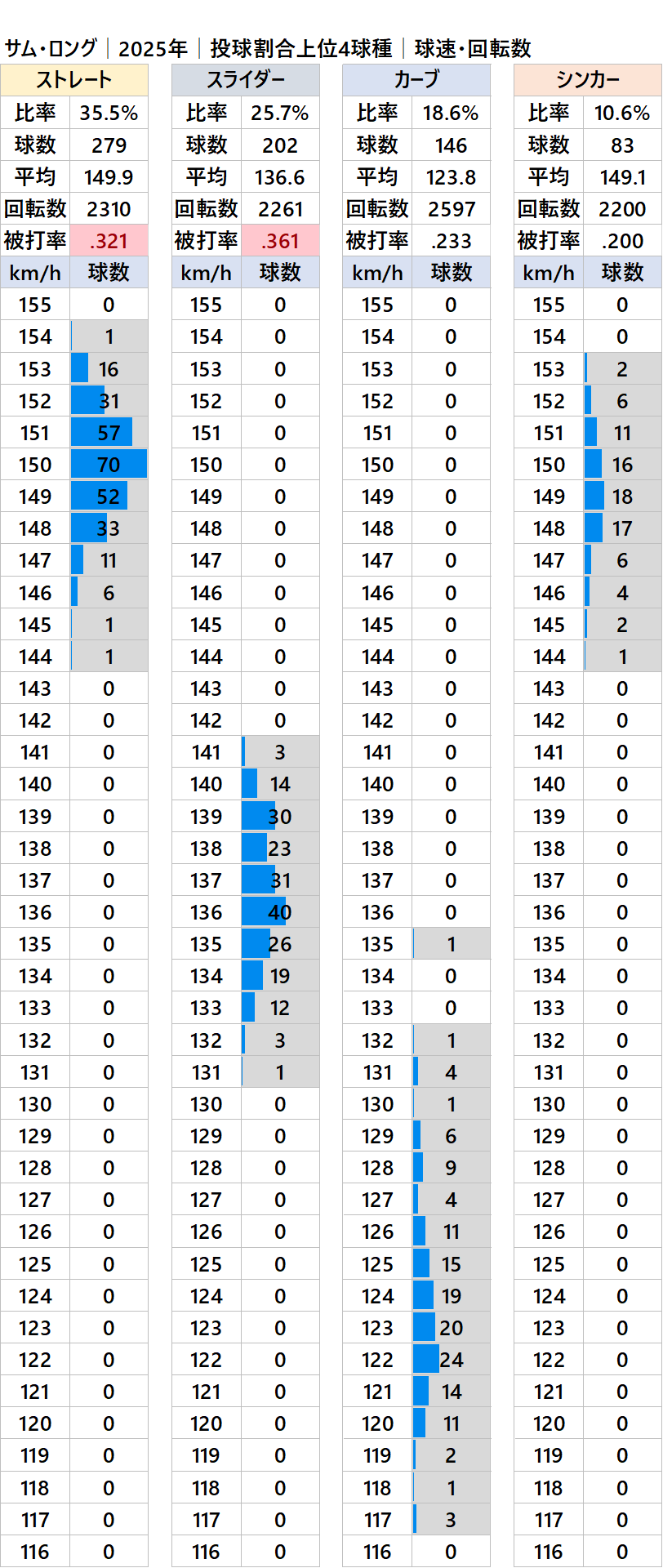 サム・ロング投手|球速・球種・被打率│2025│球速ドットコム
