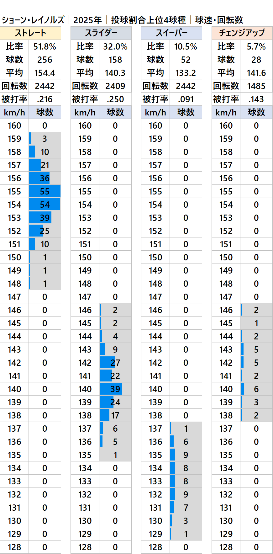 2026年シーズンよりNPB移籍が噂されているショーン・レイノルズ投手(右投)の2025年シーズンの球種別の投球割合・球速・回転数・被打率の情報です。