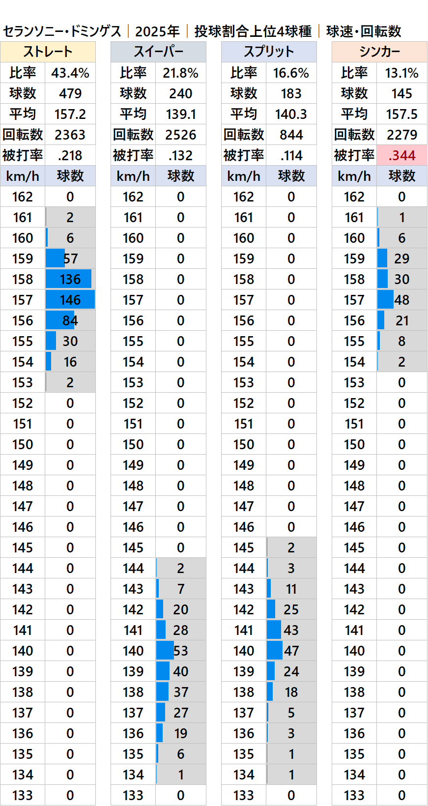 ブルージェイズのセランソニー・ドミンゲス投手の2025年シーズンの球種別の投球割合・球速・回転数・被打率の情報です。