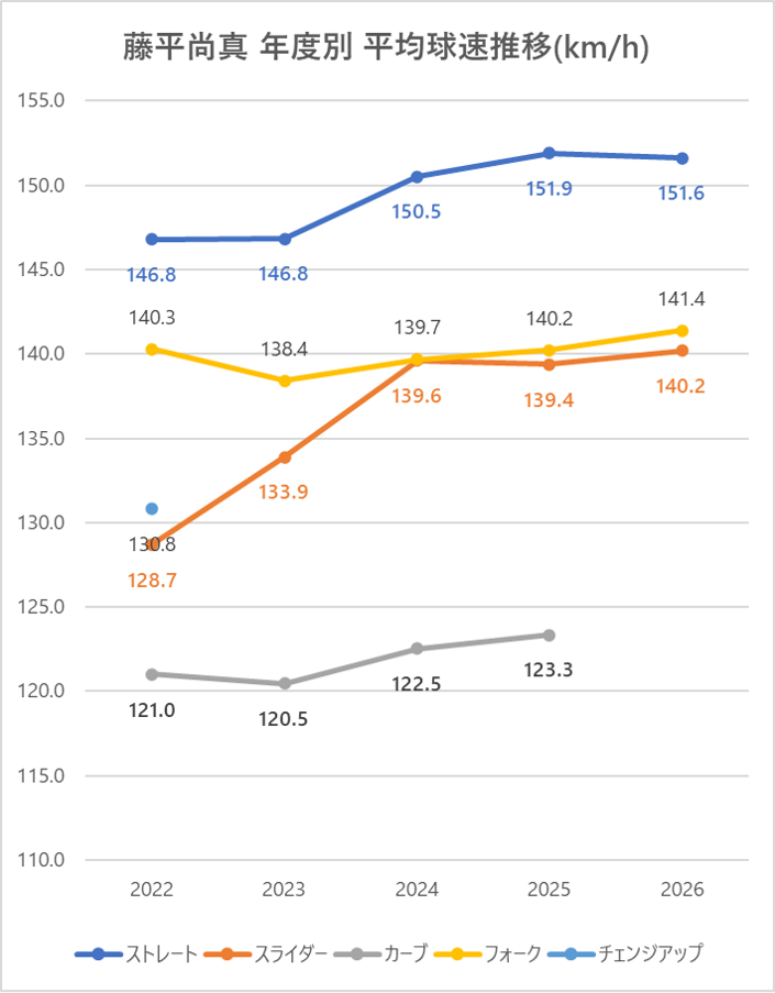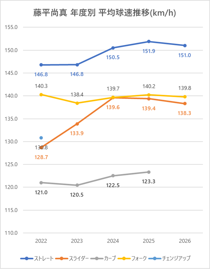 ストレートの平均球速は2025年と比較し0.9km/h低下。