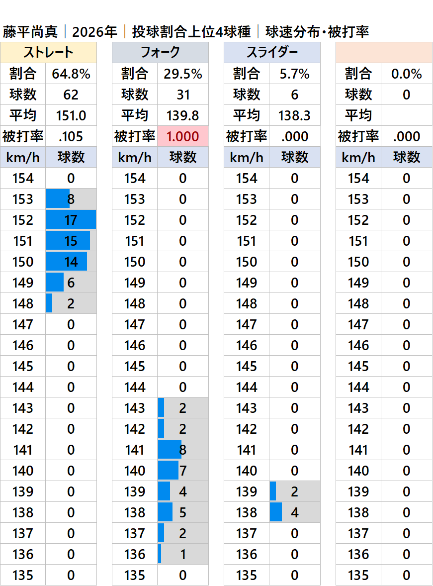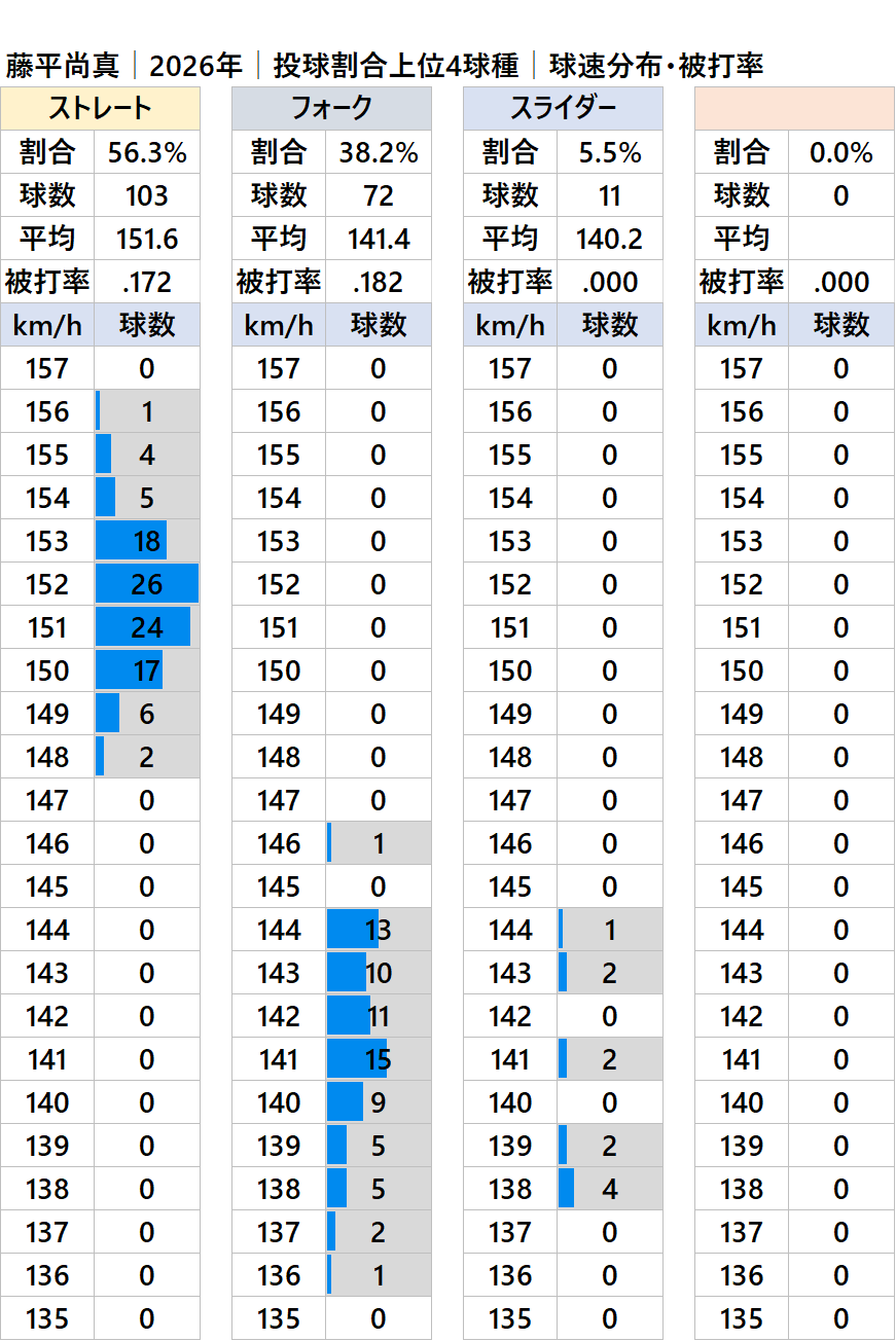 楽天の藤平尚真投手(右投)の2026年シーズンの球種別の投球割合・球速・被打率の情報です。