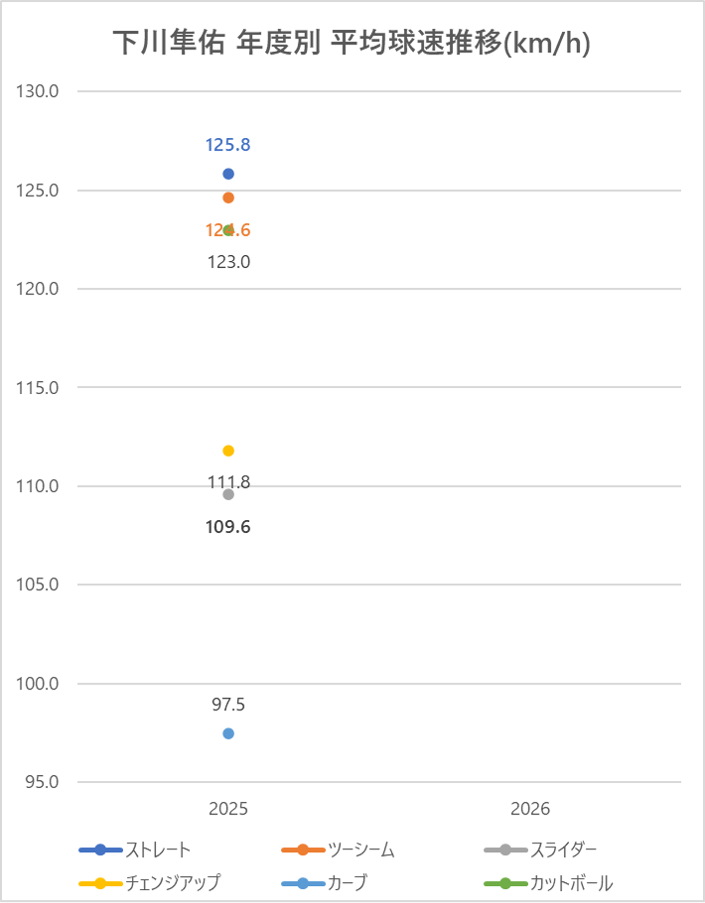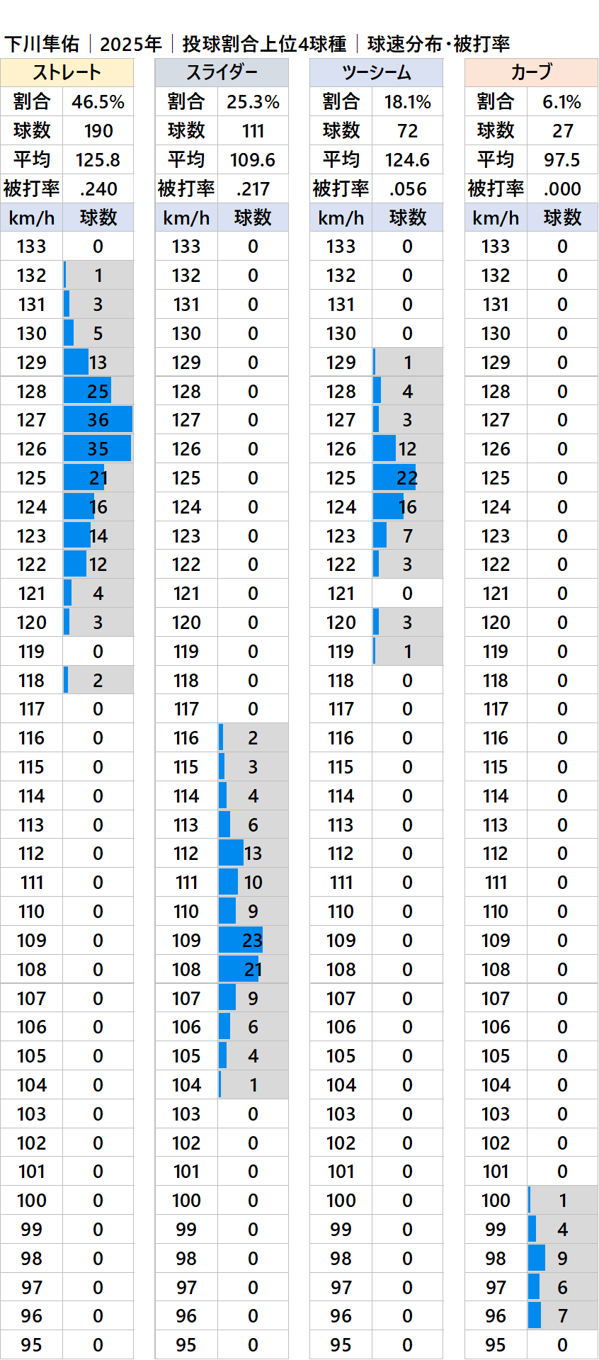 ヤクルトの下川隼佑投手の2025年シーズンの球種別の球速・投球割合・被打率の情報です。