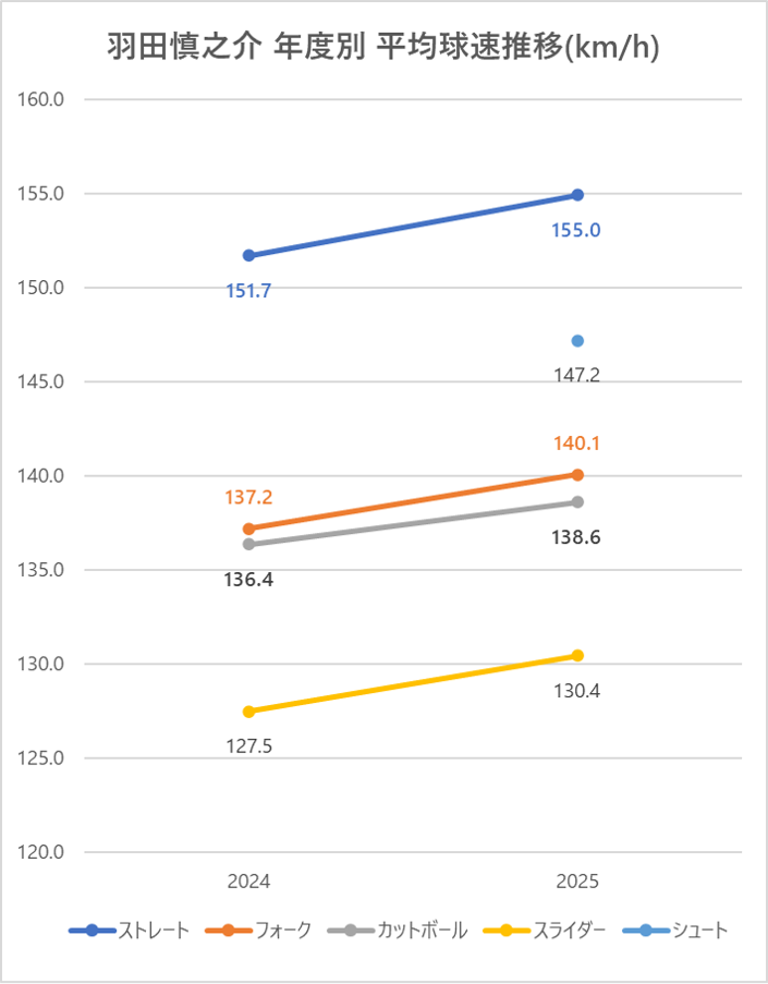 2024年と比較しストレートの平均球速は3.3km/h上昇。