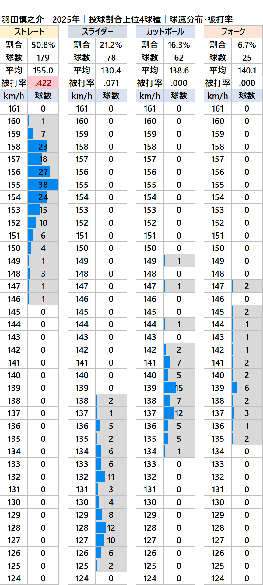 西武の羽田慎之介投手の2025年シーズンの球種別の投球割合・球速・被打率の情報です。