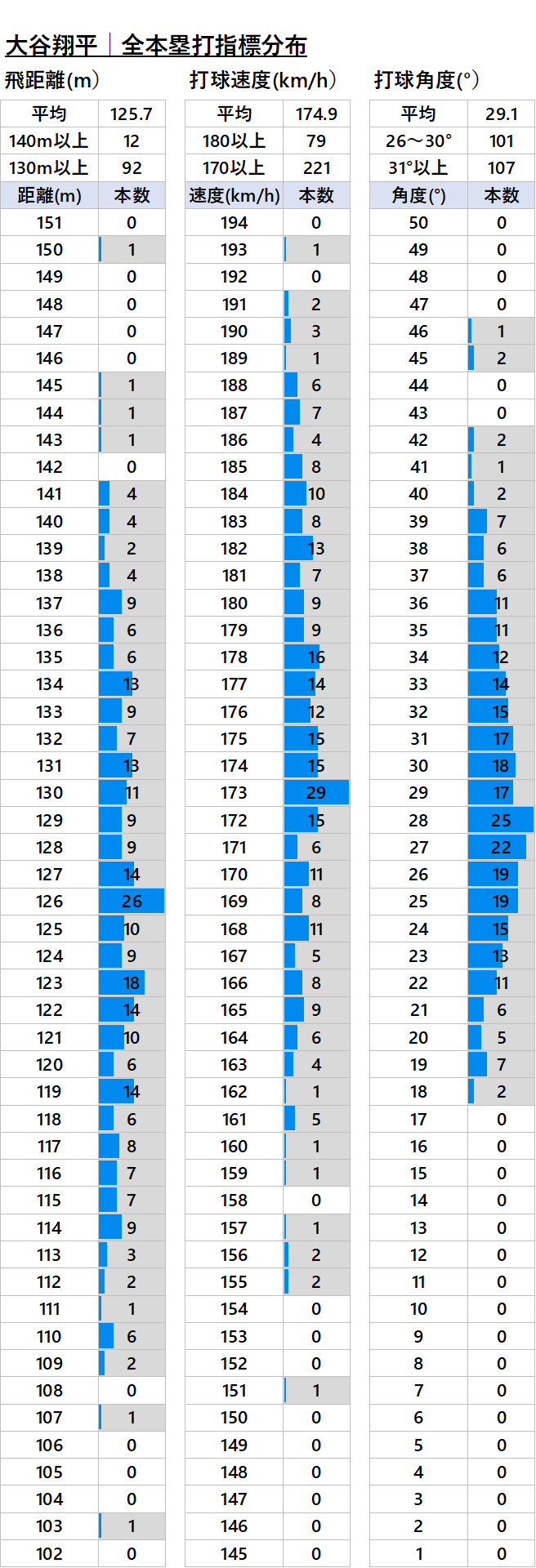 | 年度 | 本数 | 平均 飛距離 | 平均 打球速度 | 平均 角度 |