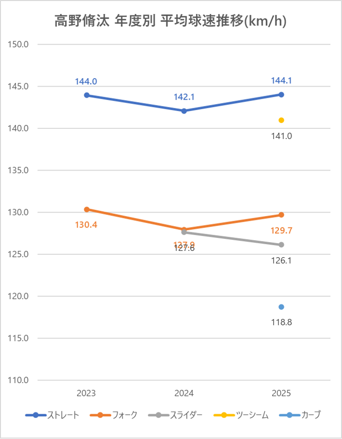 ストレートの平均球速は2024年と比較し2km/h上昇。
