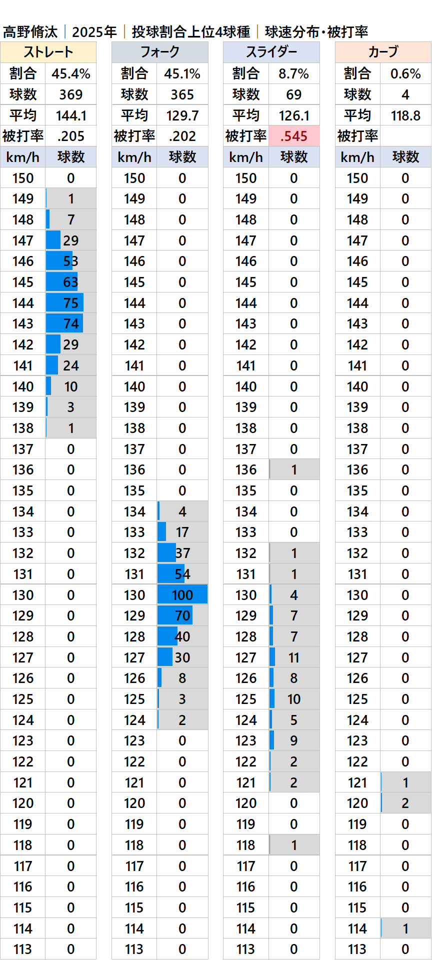 ロッテの高野脩汰投手の2025年シーズンの球種別の投球割合・球速・被打率の情報です。