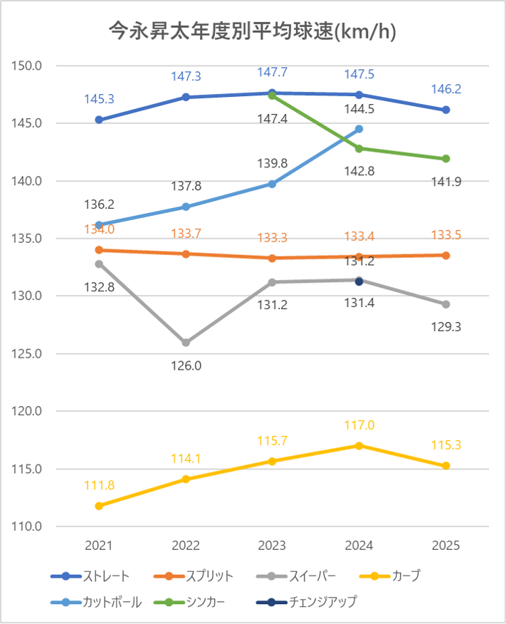 ストレートの平均球速は2024年と比較して1.3km/h低下。
