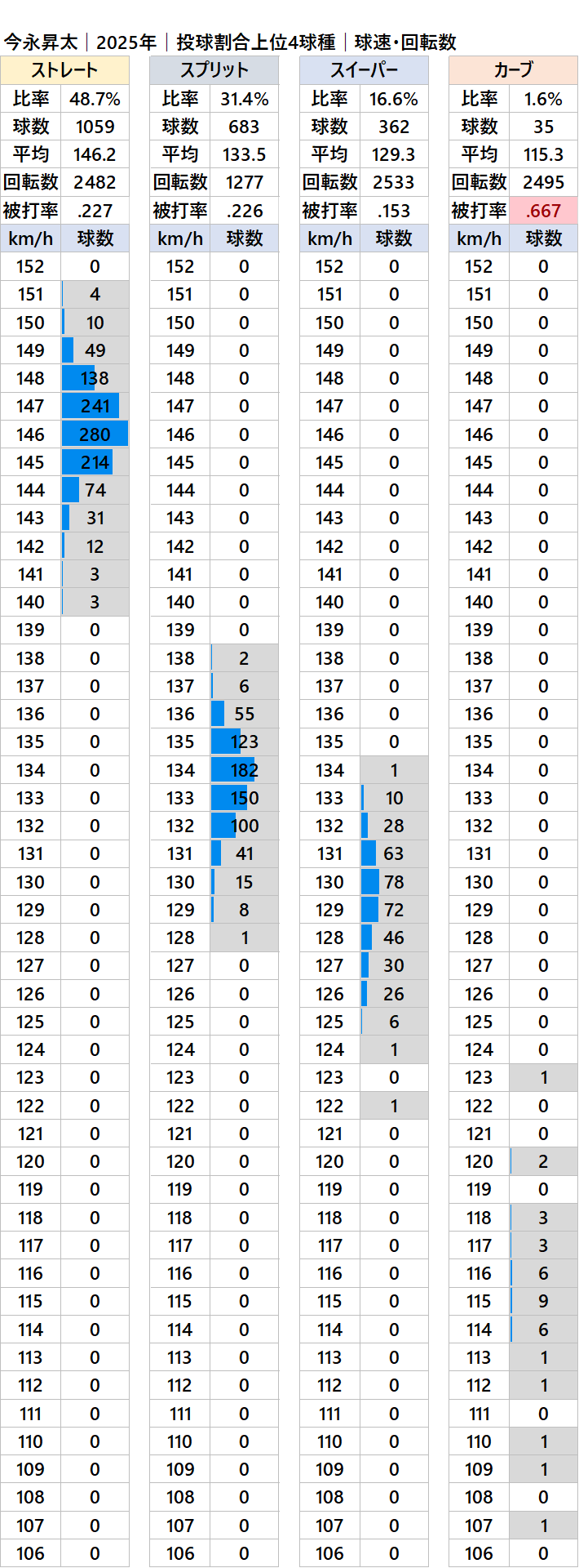 球種別球速・投球割合・被打率