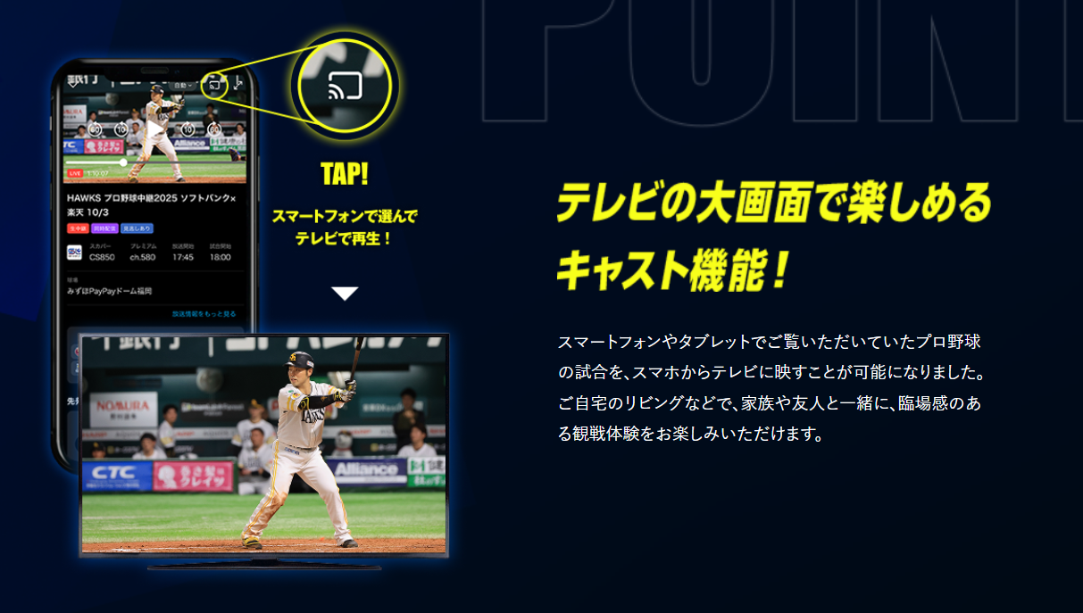 スカパー!プロ野球セットはアプリからのキャスト再生に対応しており、アプリからワンタップでテレビに写すことが可能です。