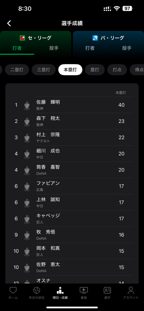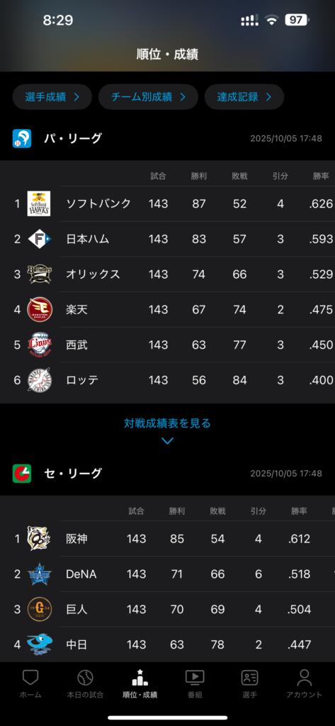 スカパー!プロ野球セットアプリの機能│③順位・成績