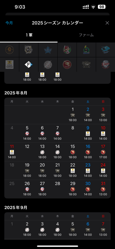 チームのロゴをタップする事で今後の対戦相手のロゴがカレンダー上にビジュアル表示され、日付をタップする事でライブ視聴可能なイニング速報の画面に移動します。