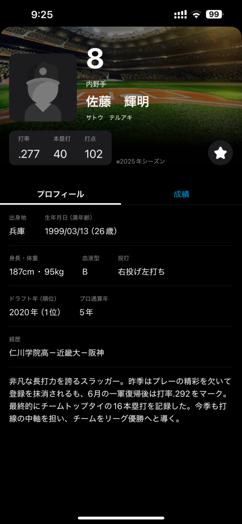 選手の年度別成績やプロフィール・ひとくちコメントなどを確認できます。