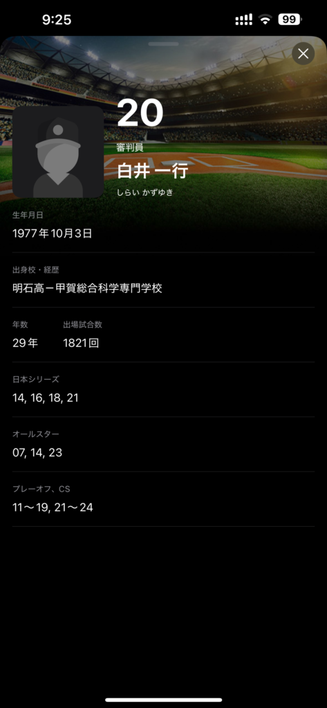 選手だけでなく、首脳陣や審判員の情報も確認できます。