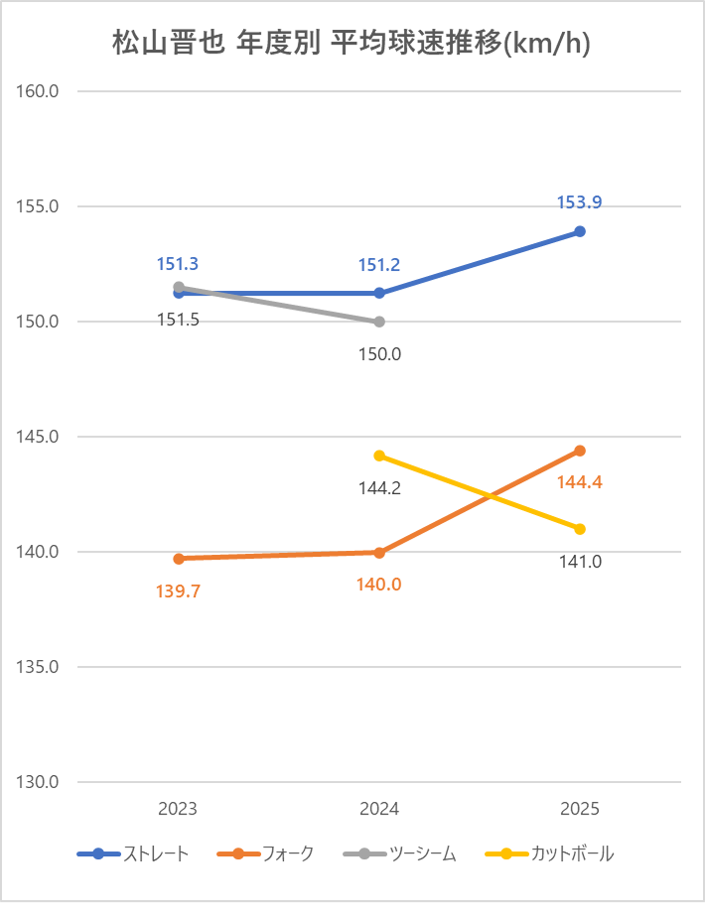 2024年と比較しストレートの平均球速は2.7km/h上昇。
