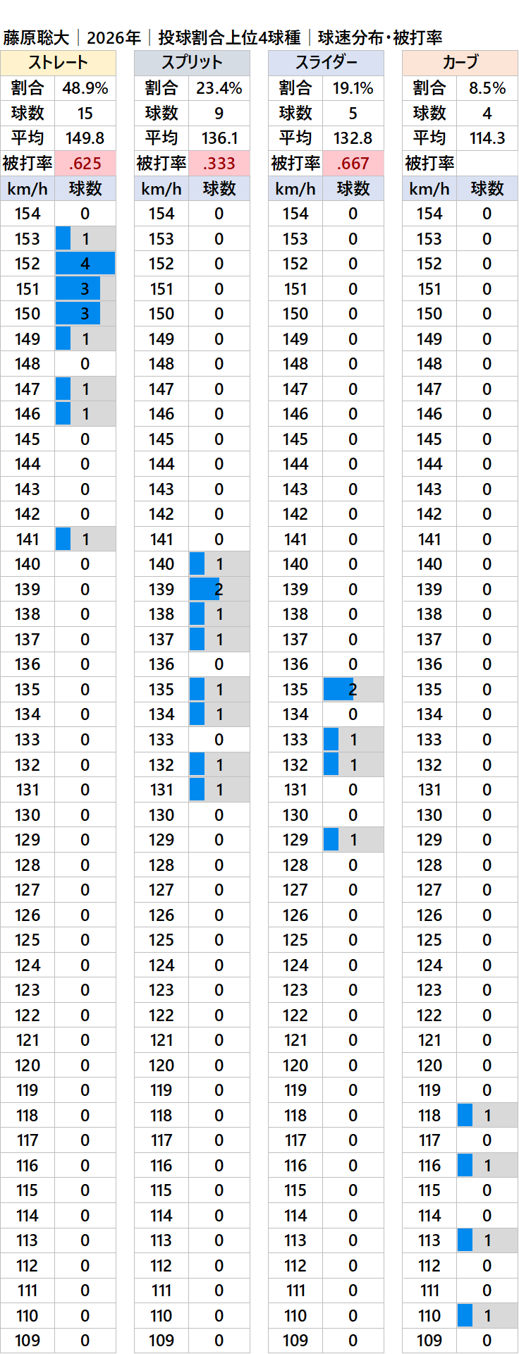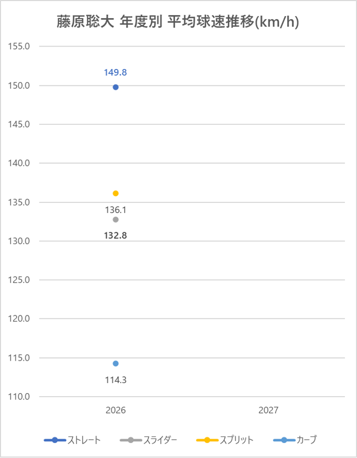 楽天の藤原聡大投手(右投)の2026年シーズンの球速・球種・被打率の情報です。