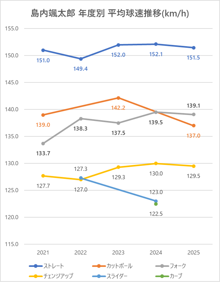 ストレートの平均球速は2024年と比較し0.6km/h低下。