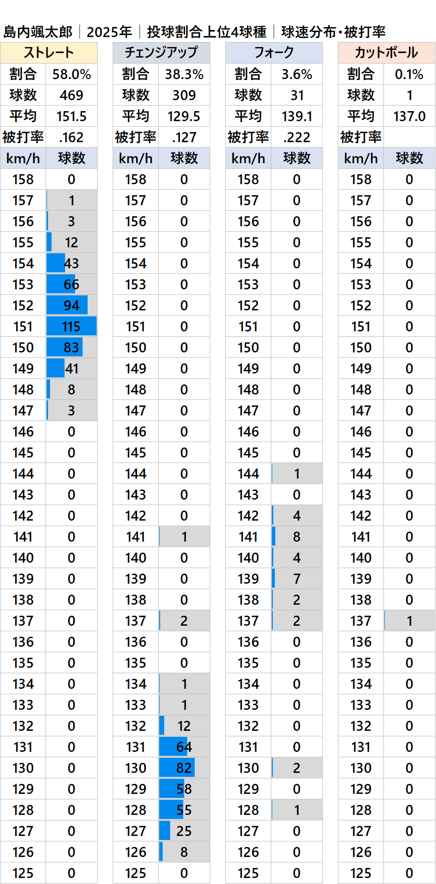 広島の島内颯太郎投手の2025年シーズンの球種別の投球割合・球速・被打率の情報です。