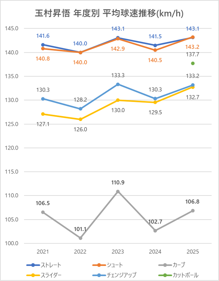 2024年と比較しストレートの平均球速は1.6㎞/h上昇。
