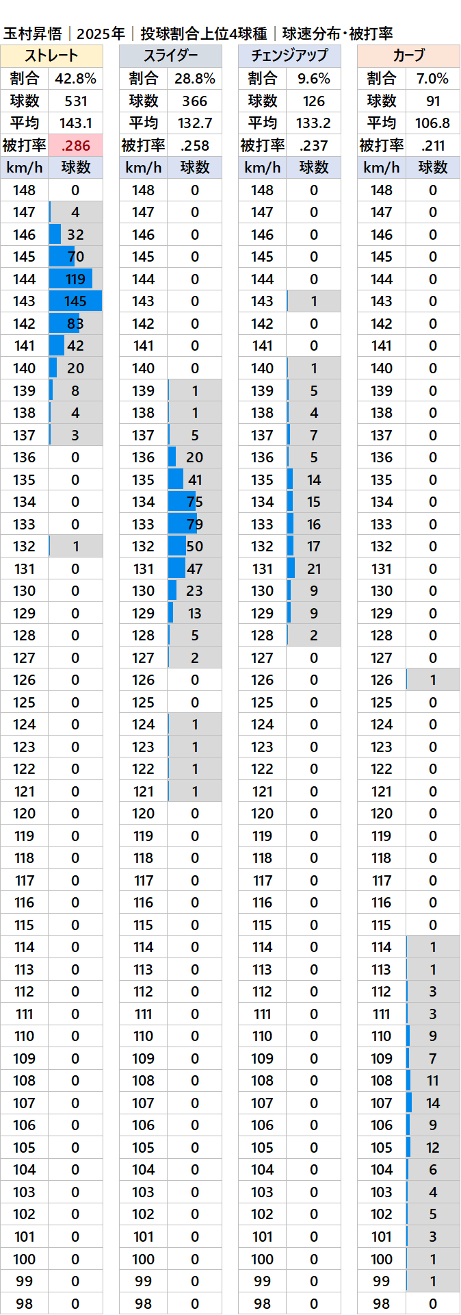 広島の玉村昇悟投手の2025年シーズンの球種別の投球割合・球速・被打率の情報です。