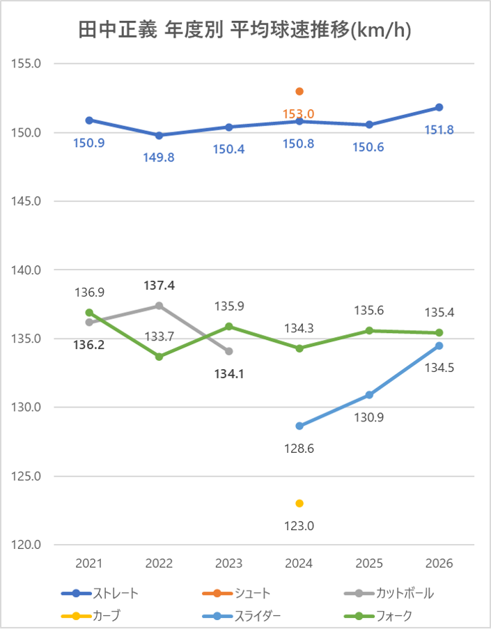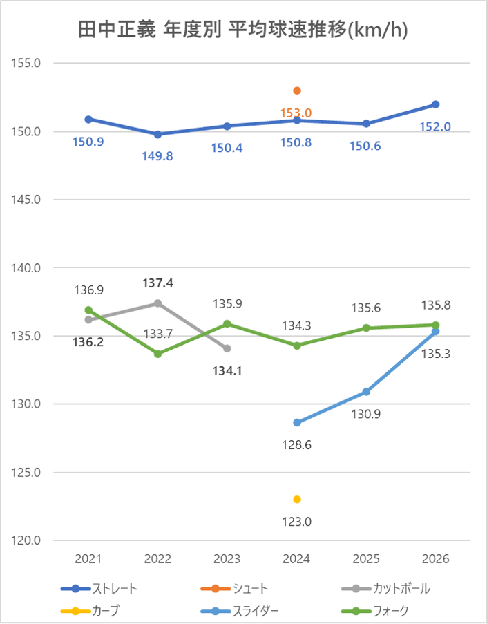 2025年と比較し、ストレートの平均球速は1.4km/h上昇。