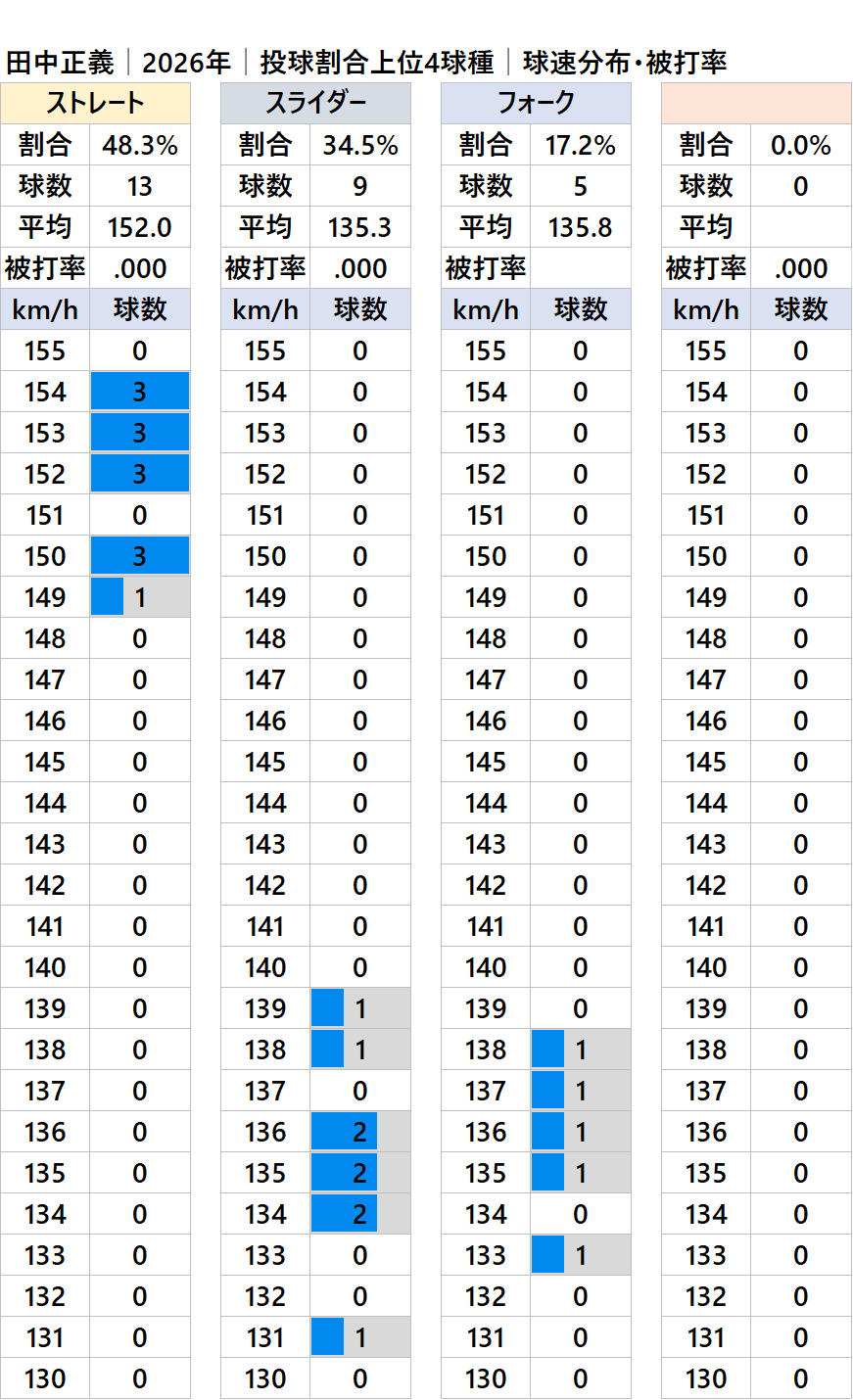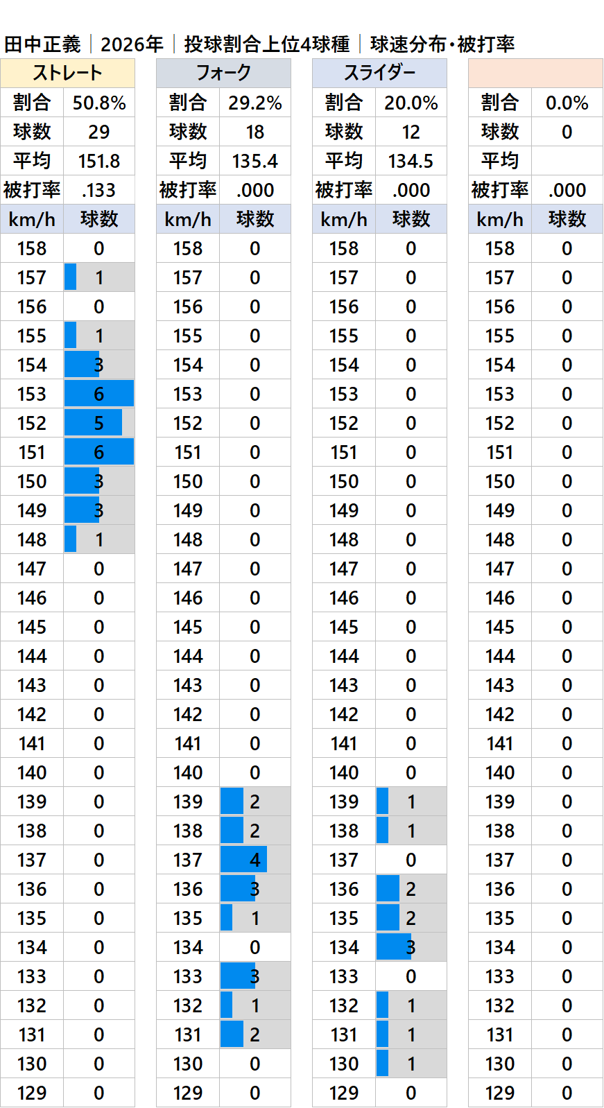 日本ハムの田中正義投手(右投)の2026年シーズンの球種別の投球割合・球速・被打率の情報です。