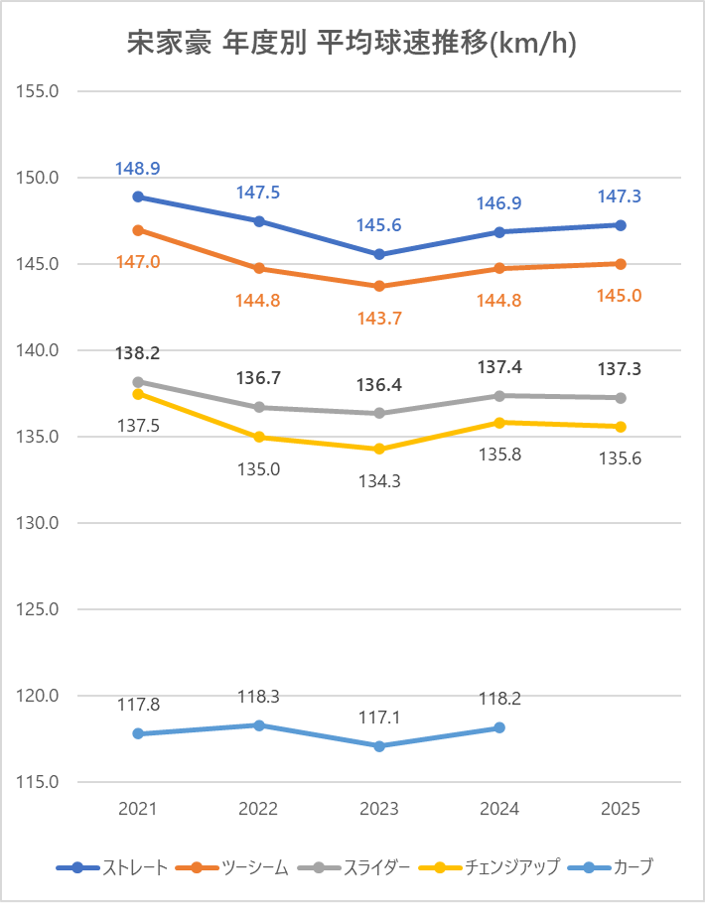 ストレートの平均球速は2024年と比較し0.4km/h上昇。