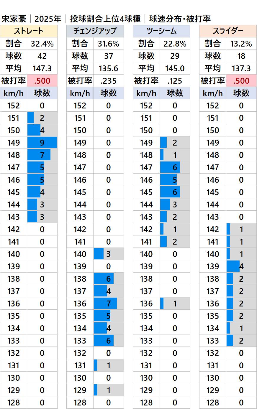 楽天の宋家豪投手(右投)の2025年シーズンの球種別の投球割合・球速・被打率の情報です。