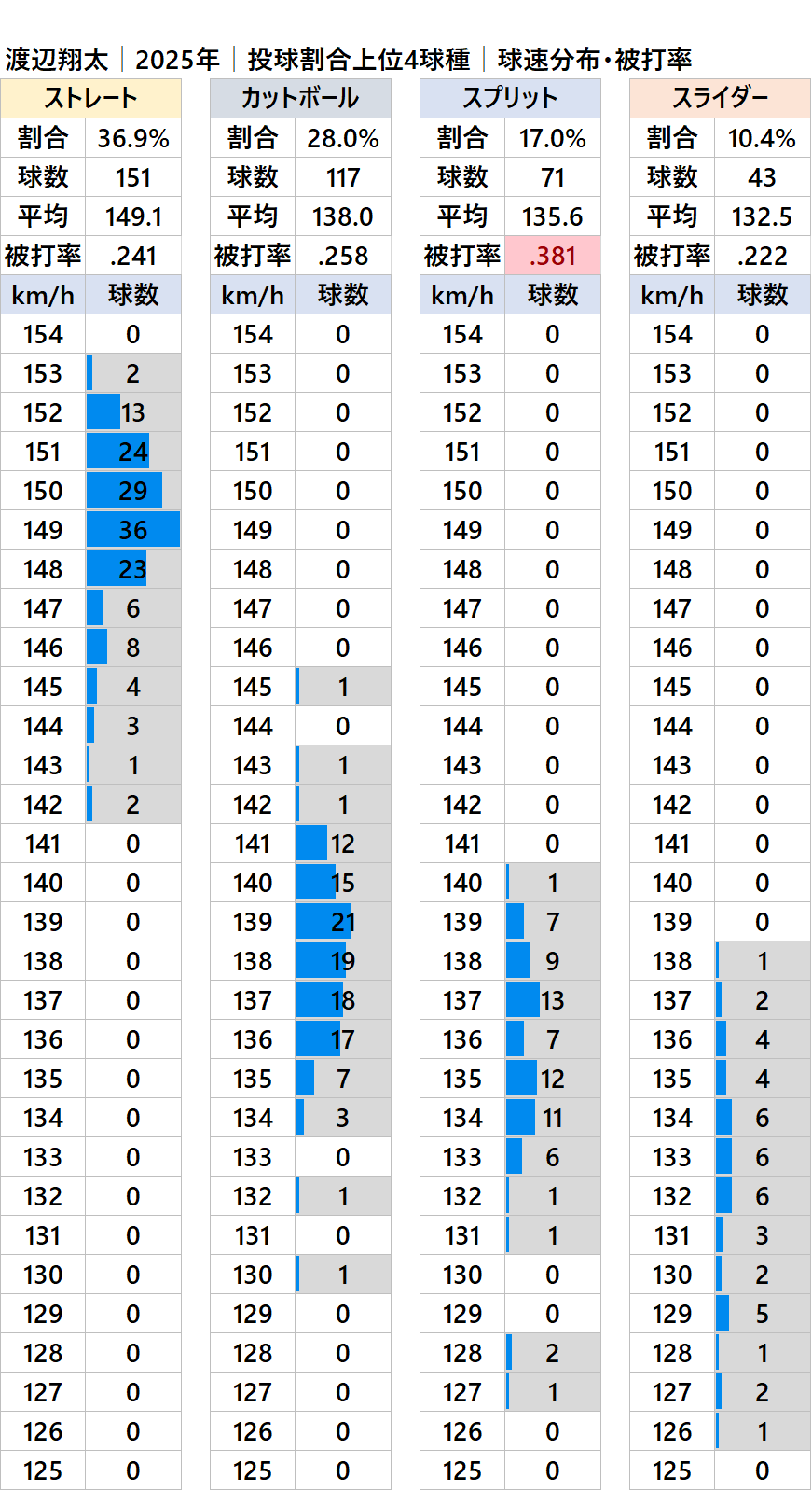 楽天の渡辺翔太投手(右投)の2025年シーズンの球種別の投球割合・球速・被打率の情報です。