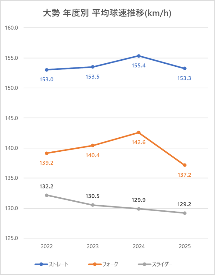 2024年と比較してストレートの平均球速は約2km/h低下。