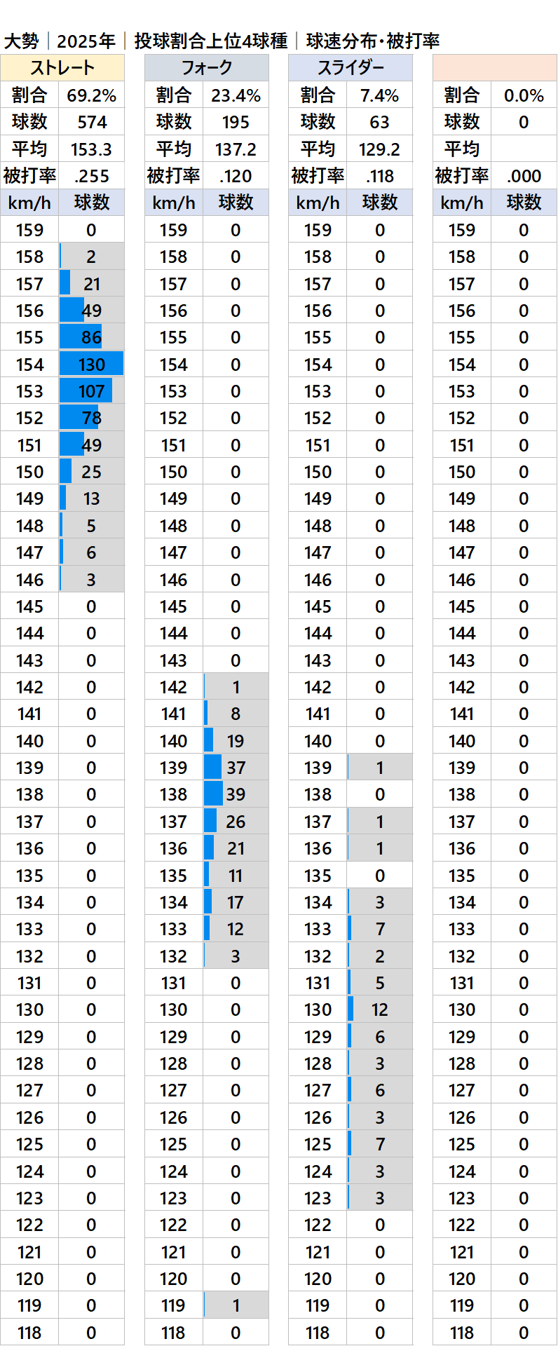巨人の大勢投手の2025年シーズンの球種別の投球割合・球速・被打率の情報です。