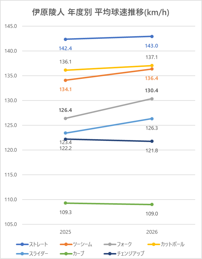 2025年と比較しストレートの平均球速は0.6km/h上昇。