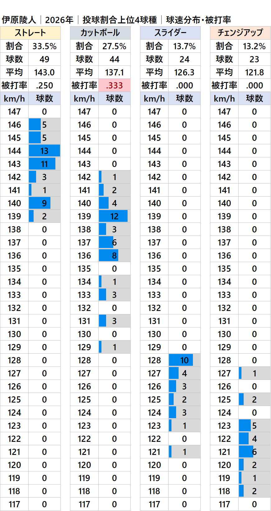 阪神の伊原陵人投手(左投)の2026年シーズンの球種別の投球割合・球速・被打率の情報です。