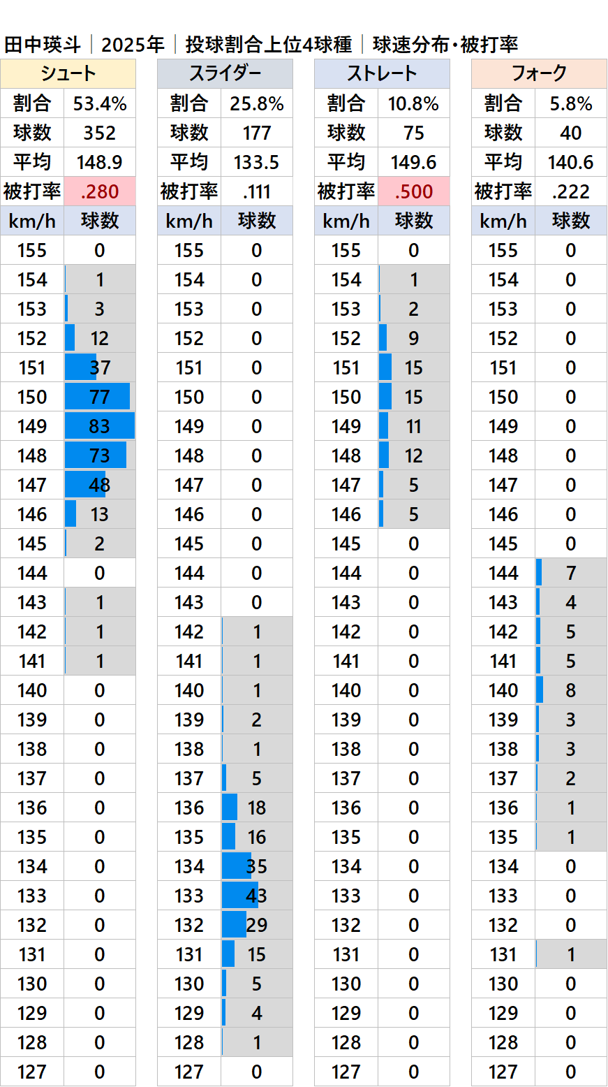 巨人の田中瑛斗投手の2025年シーズンの球種別の投球割合・球速・被打率の情報です。