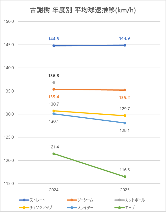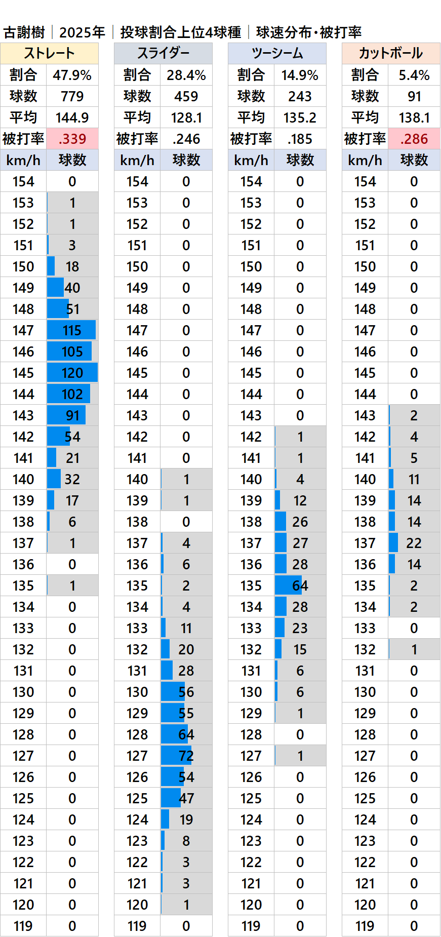 楽天の古謝樹投手(左投)の2025年シーズンの球種別の投球割合・球速・被打率の情報です。