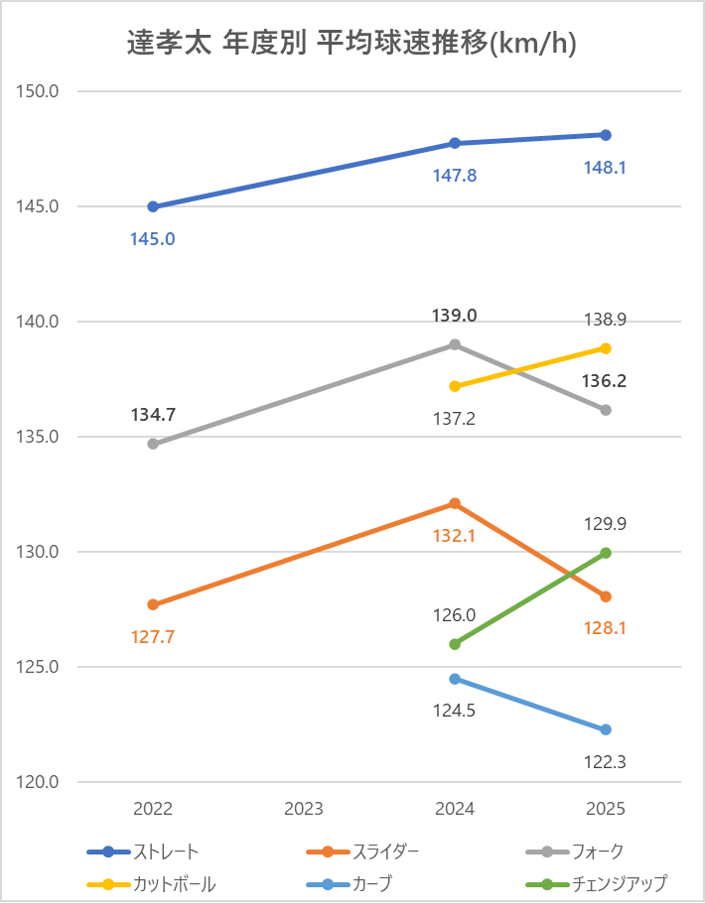 ストレートの平均球速は2024年と比較し0.3km/h上昇。