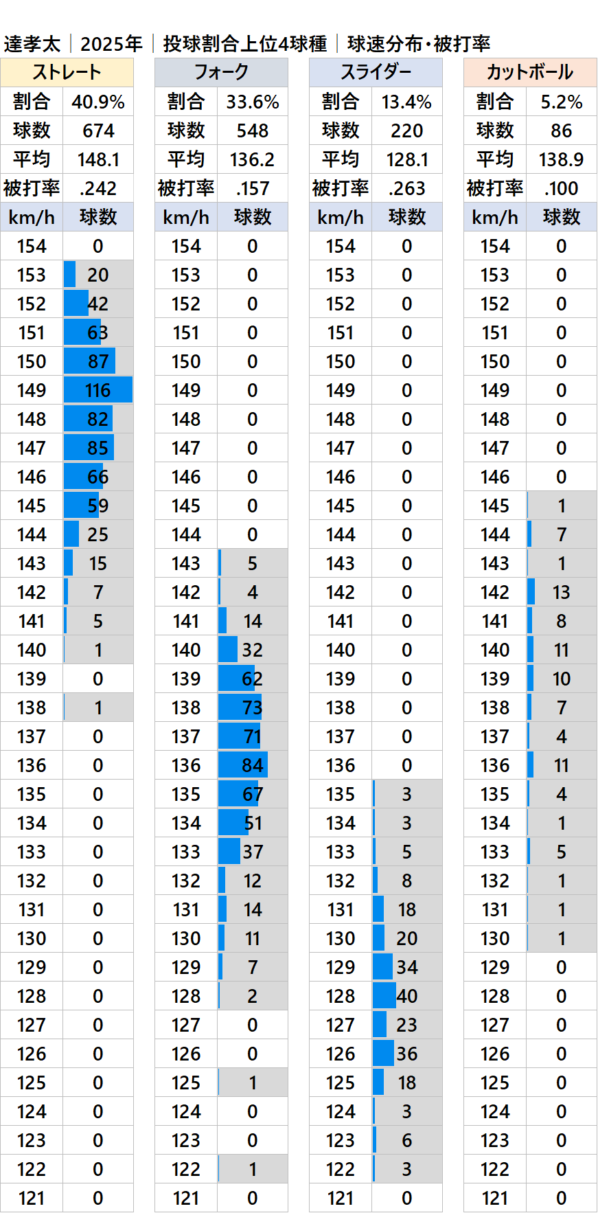 日本ハムの達孝太投手の2025年シーズンの球種別の投球割合・球速・被打率の情報です。