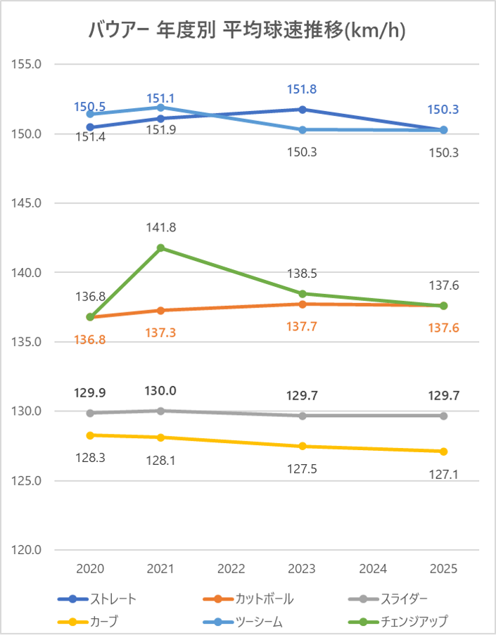 ストレートの平均球速は前回在籍した2023年と比較して1.5 km/h低下。