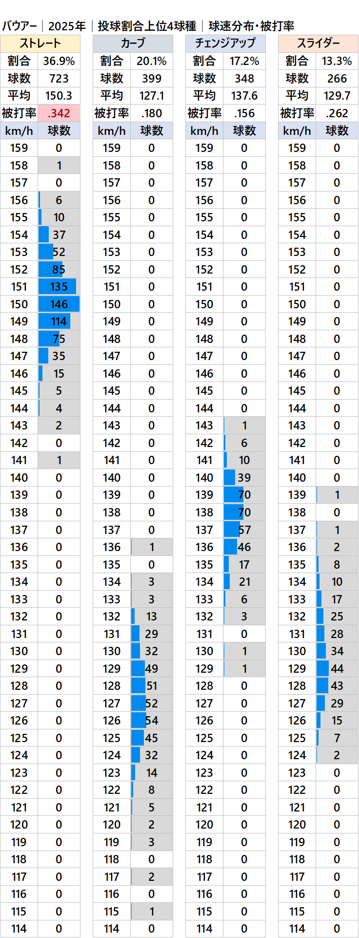 DeNAのトレバー・バウアー投手の2025年シーズンの球種別の投球割合・球速・被打率の情報です。