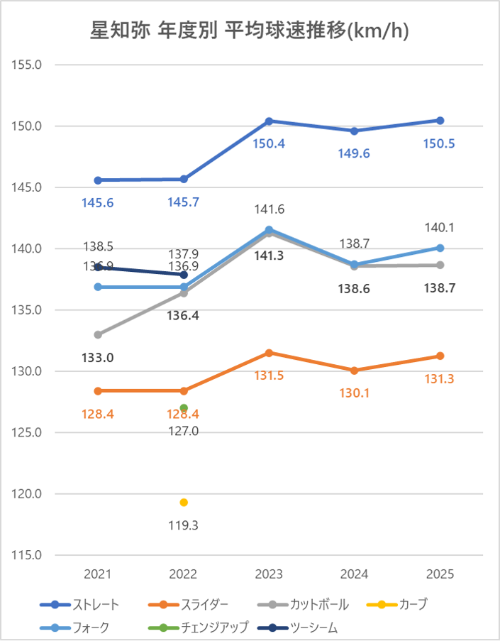 2024年と比較しストレートの平均球速は1km/h上昇。