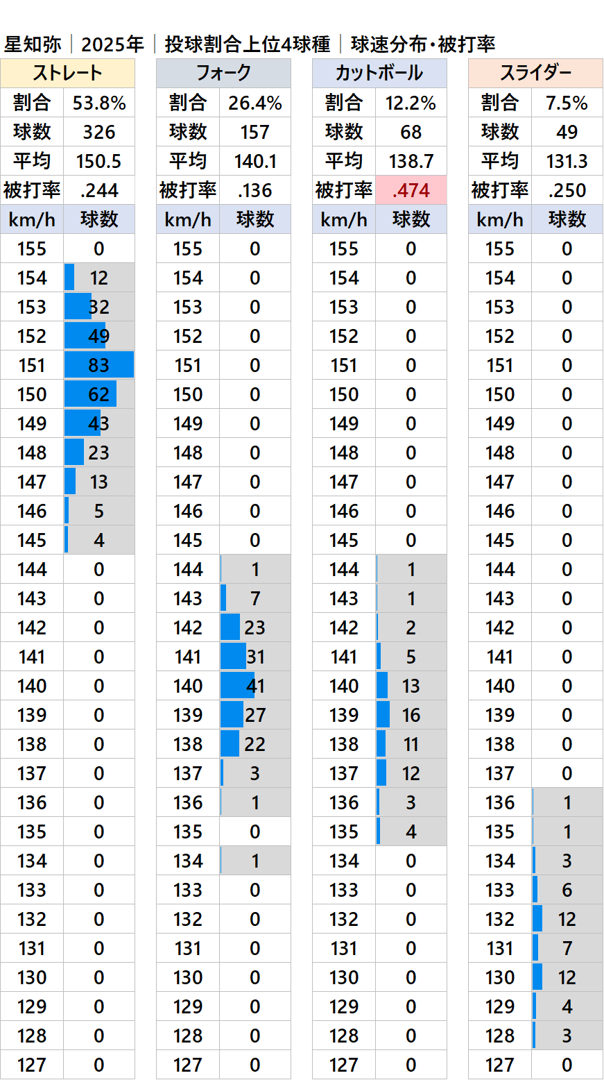 ヤクルトの星知弥投手(右投)の2025年シーズンの球種別の投球割合・球速・被打率の情報です。