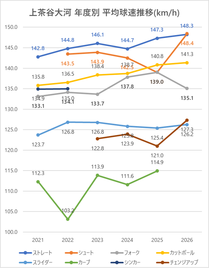 ストレートの平均球速は2024年と比較して2.6km/h低下。