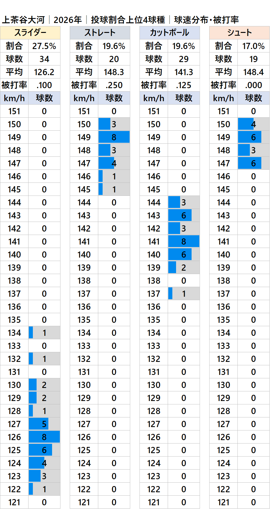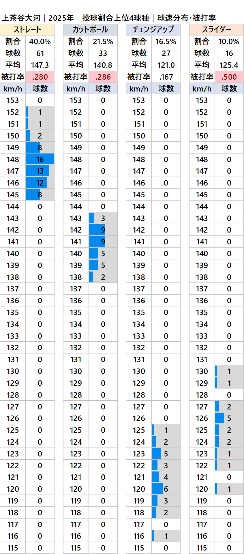 球種別球速・投球割合・被打率