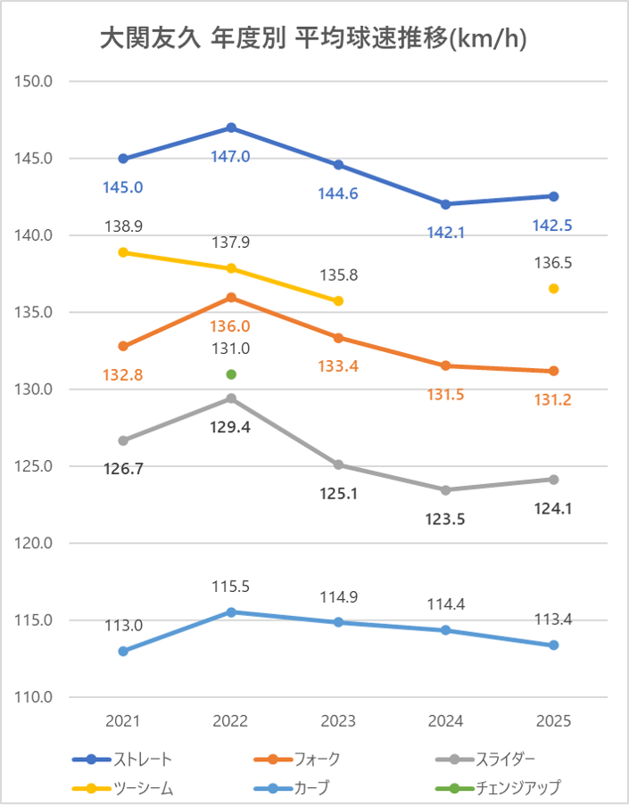ストレートの平均球速は2024年と比較し0.4km/h上昇。