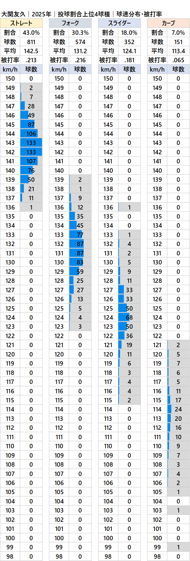 ソフトバンクの大関友久投手の2025年シーズンの球種別の投球割合・球速・被打率の情報です。