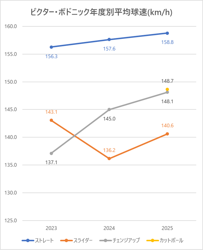 2024年と比較し、ストレート(4シーム)の平均球速は1.2km/h上昇。