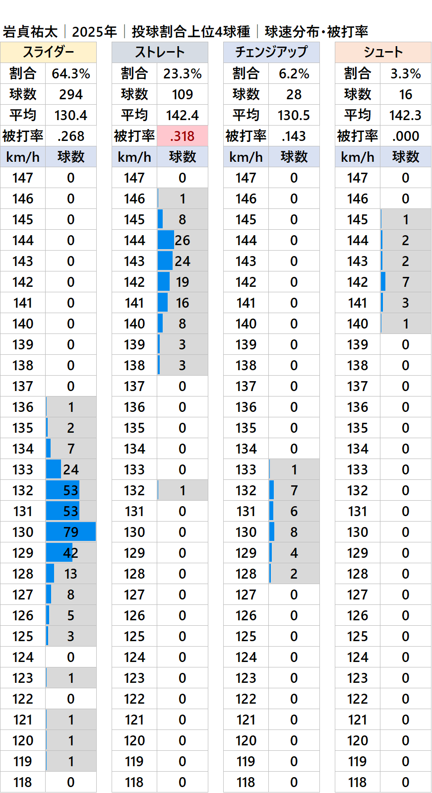 阪神の岩貞祐太投手の2025年シーズン球種別の投球割合・球速・被打率の情報です。