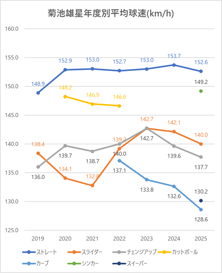 4シームの平均球速は2024年と比較し1.1km/h低下。